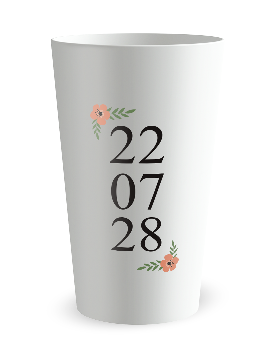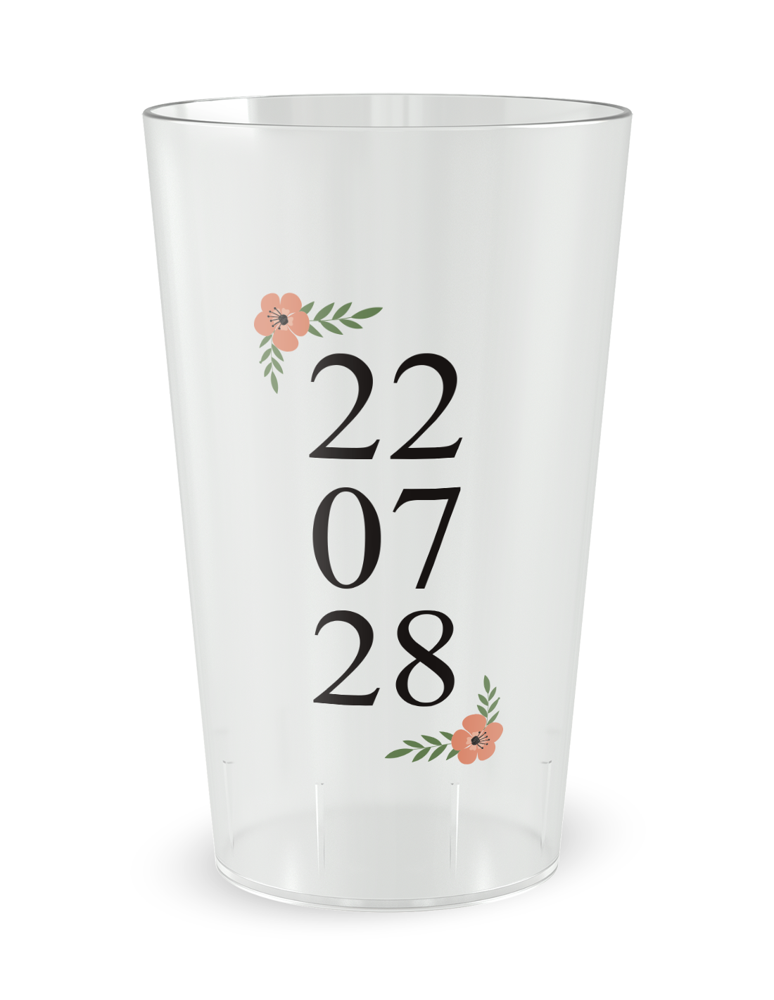 L'attrait magnétique de cette création repose sur une esthétique minimaliste et percutante, plaçant le calendrier de votre bonheur au centre de tous les regards. Les chiffres symbolisant votre grand jour se déploient avec une précision chirurgicale sur l'intégralité de la paroi cylindrique, créant un repère visuel fort pour votre entourage. Que vous succombiez à la douceur d'un fini givré translucide élégant, laissant subtilement deviner les reflets ambrés de vos cocktails, ou que vous optiez pour la puissance d'un fond blanc opaque éclatant qui décuple la netteté des caractères, l'impact de ce verre personnalisé mariage demeure foudroyant. Les encres de très haute technologie fusionnent littéralement avec la matière plastique, garantissant un contraste saisissant qui transforme cet objet en une véritable pièce maîtresse de votre scénographie. Cette identité graphique sobre s'accorde divinement avec des centres de table floraux, des nappages en lin brut et des éclairages tamisés, apportant une touche de panache incontestable à votre réception.