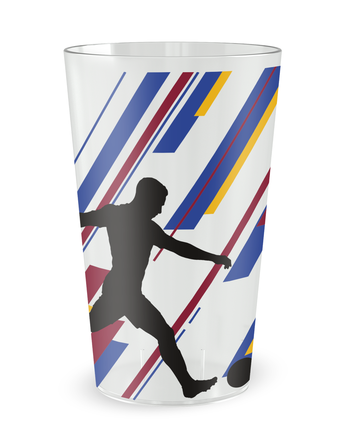 L'esthétique de ces gobelets publicitaires dédiés à l'univers du football repose sur une conception graphique épurée mettant en scène la silhouette dynamique d'un joueur en pleine action. Que vous privilégiez la transparence moderne du fini givré ou l'éclat pur du blanc opaque pour un contraste maximal avec vos couleurs de club, la qualité d'impression numérique réalisée dans nos usines de l'Ain assure une restitution parfaite de chaque détail. Cette technologie de pointe permet une fusion totale de l'encre avec la matière, garantissant que votre visuel ne s'altère jamais, même sous l'effet des manipulations énergiques lors des célébrations de buts ou des passages fréquents à la buvette. Le design "Silhouette Football" agit ainsi comme un véritable ambassadeur visuel sur votre stade, apportant une touche de professionnalisme à vos buvettes tout en renforçant l'identité de marque de votre club auprès d'un public de passionnés.