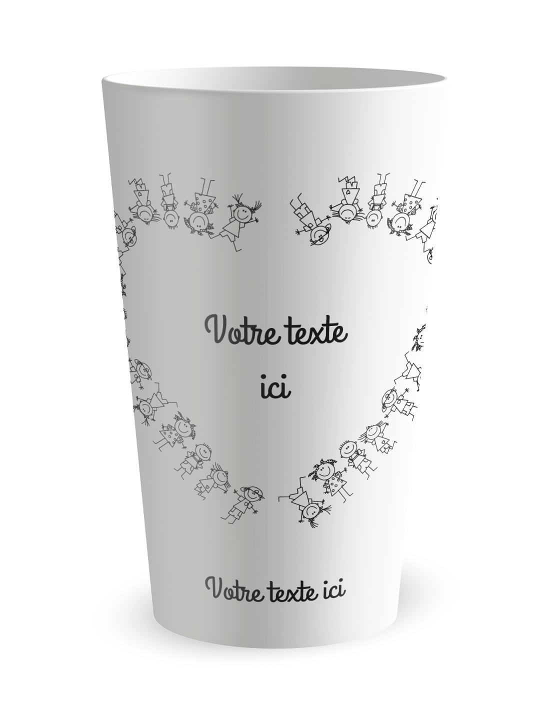 Ce gobelet avec ronde d’enfants en forme de cœur convient parfaitement à une école ou une association de parents d’élèves. Le dos, entièrement personnalisable, peut accueillir prénoms, graduation ou photo de classe. Un objet simple que les enfants gardent facilement.