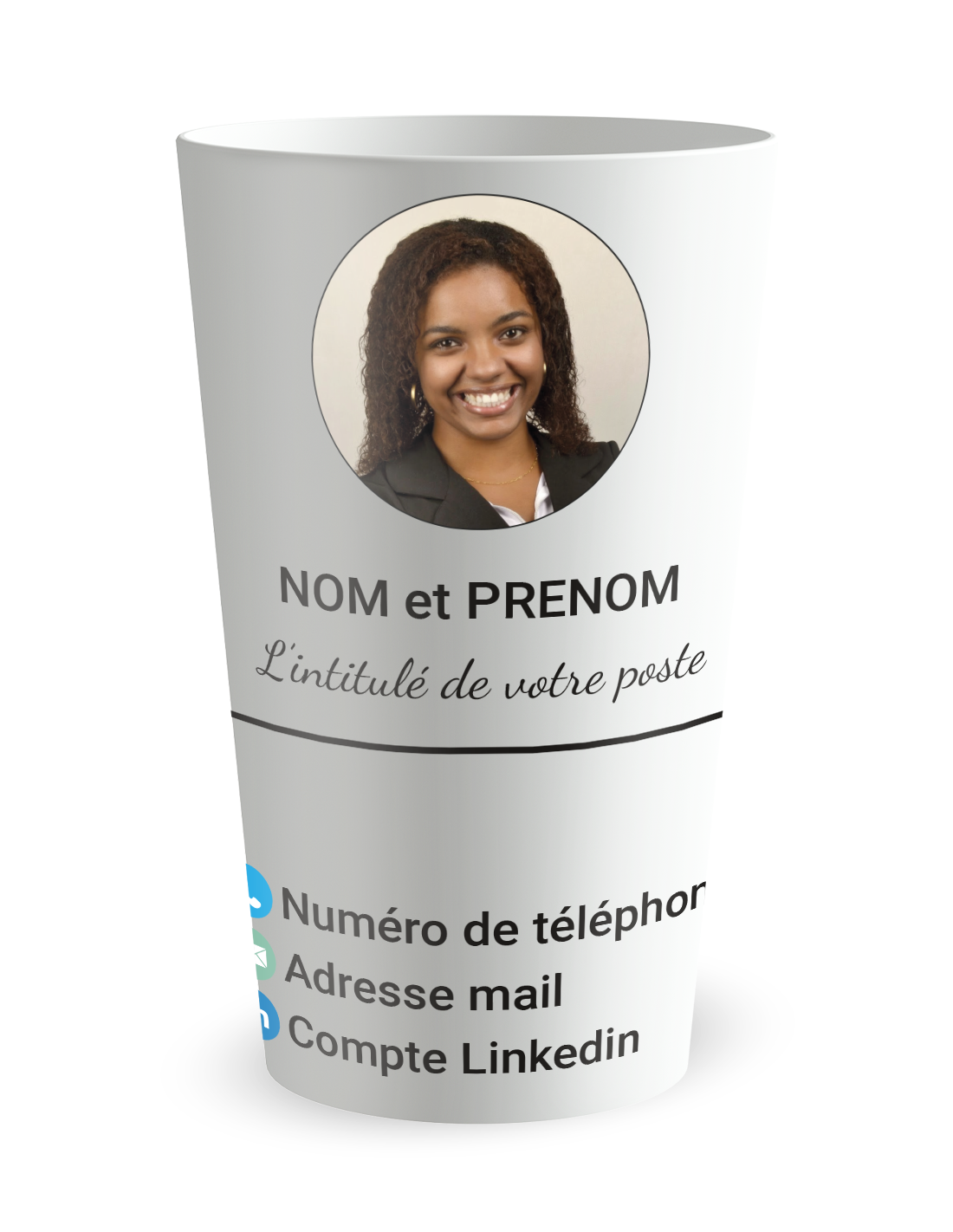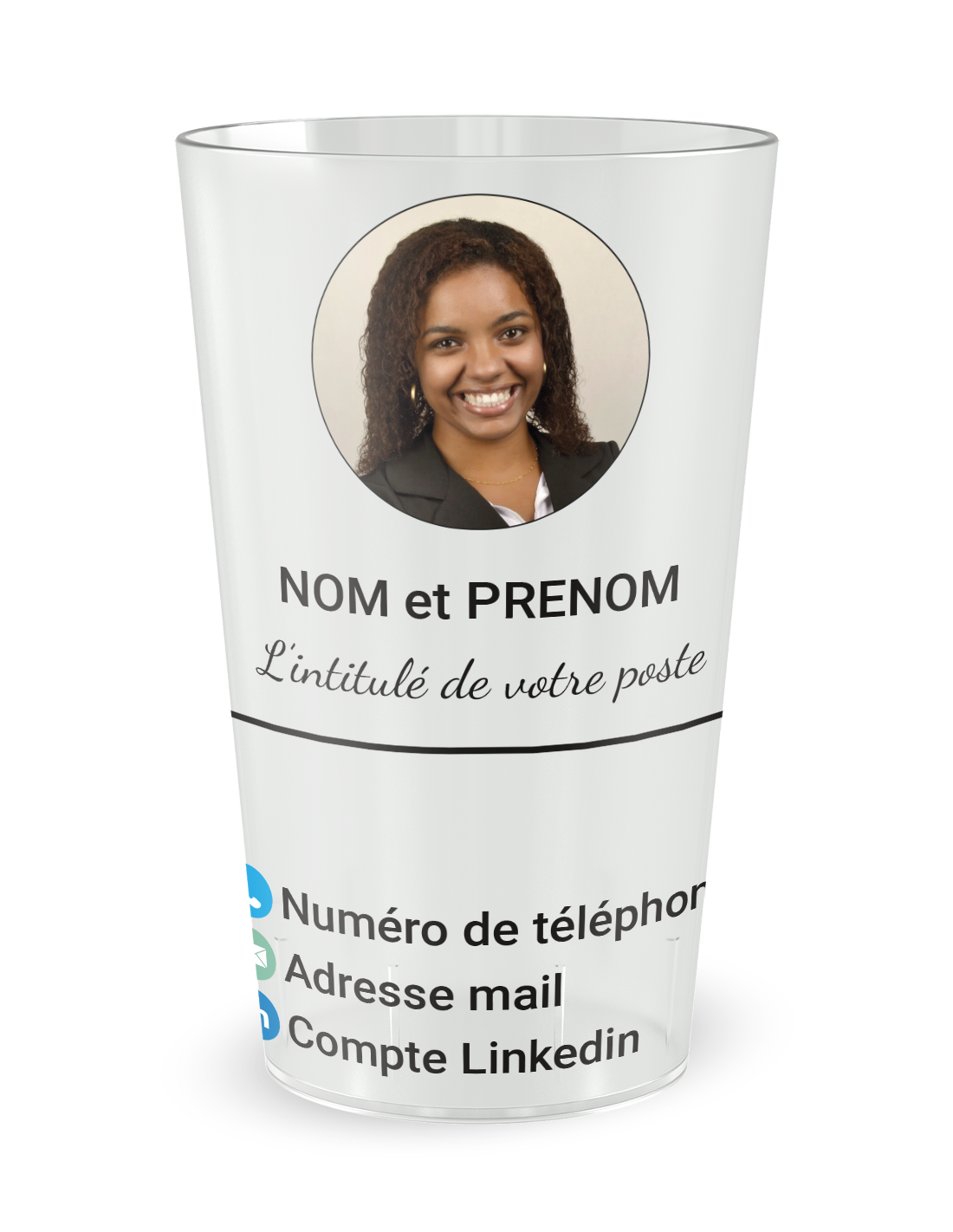 En format carte de visite, ce gobelet devient un support original à remettre à prospects, clients ou partenaires. Vous remplacez la photo par votre identité, vos coordonnées et, si besoin, une graduation. Il résume clairement qui vous êtes et reste sur le bureau longtemps après l’événement.