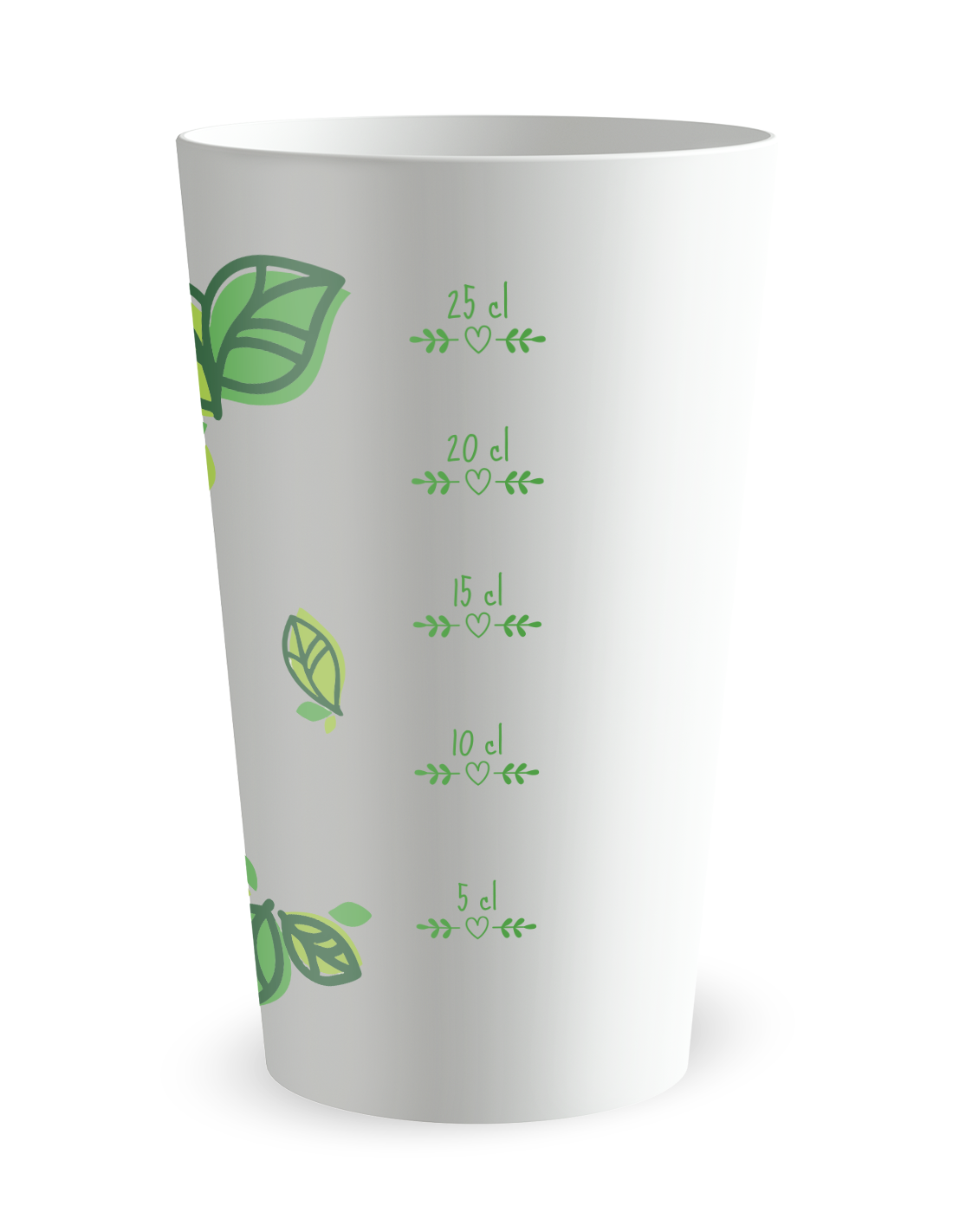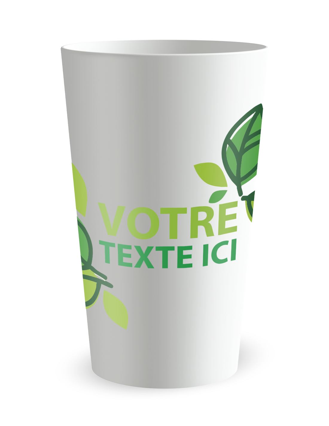 Enfin, ce modèle entouré de feuilles met votre texte au centre d’un décor verdoyant. Logo, message, coordonnées : vous choisissez ce qui doit ressortir. Un gobelet pratique à utiliser, facile à personnaliser, qui garde la même forme rassurante d’un Ecocup classique.