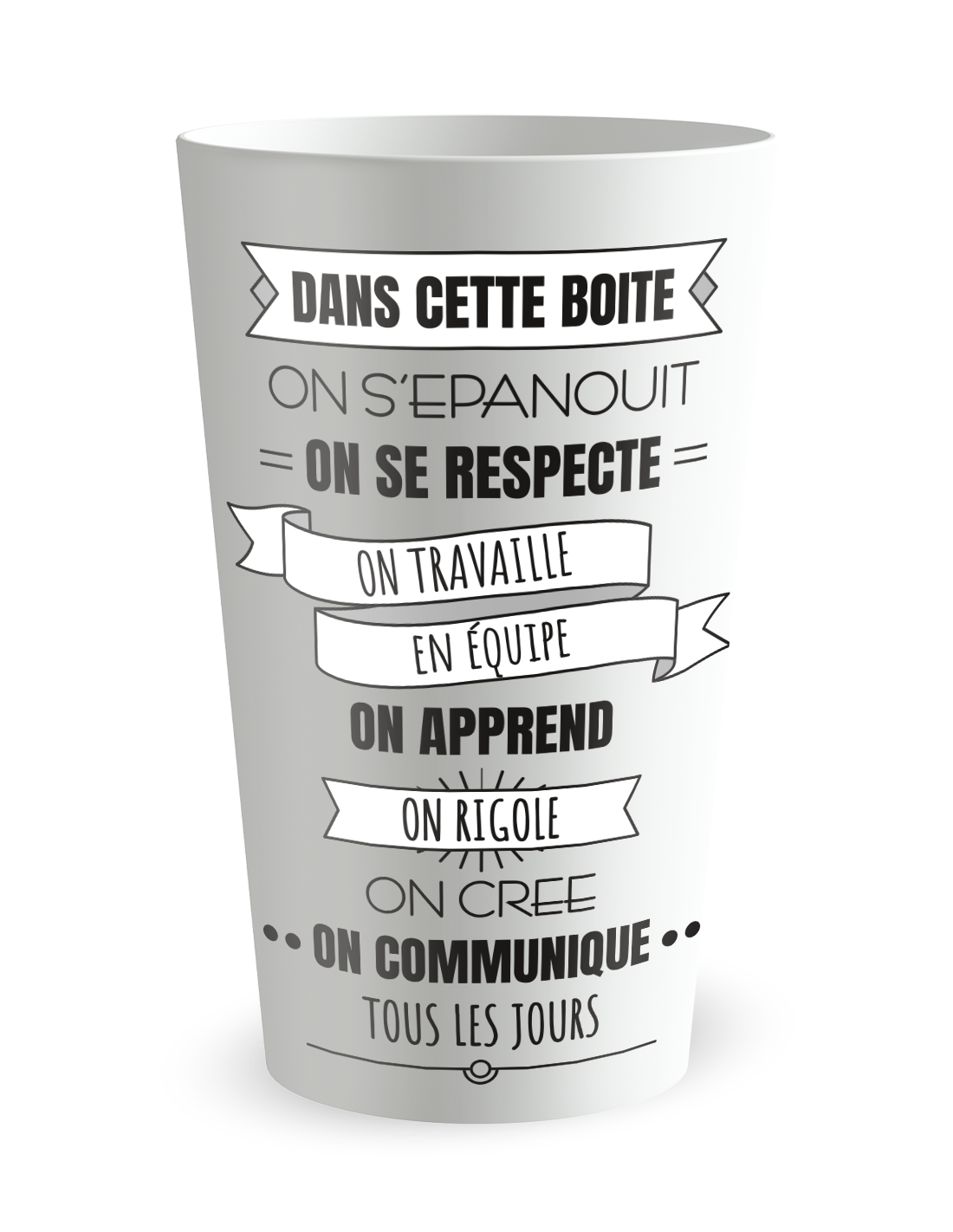 Le design de ce modèle a été spécifiquement élaboré pour capturer l'essence de la collaboration professionnelle à travers une esthétique à la fois sobre et percutante. Que vous choisissiez la finition givrée pour son élégance technologique ou le blanc opaque pour un rendu plus institutionnel, la qualité d'impression réalisée dans nos usines de l'Ain assure une restitution parfaite de chaque nuance graphique. Ces gobelets publicitaires ne se contentent pas d'afficher un motif ; ils intègrent l'identité de votre équipe au cœur même de la matière grâce à une fusion thermique de l'encre. Cette précision chirurgicale garantit que le visuel "L'Equipe" reste éclatant et net, reflétant la rigueur et l'exigence de votre organisation. Ce support visuel devient ainsi un véritable étendard qui sublime vos espaces de réception tout en apportant une touche de modernité indispensable aux entreprises qui soignent leur image de marque jusque dans les moindres détails.