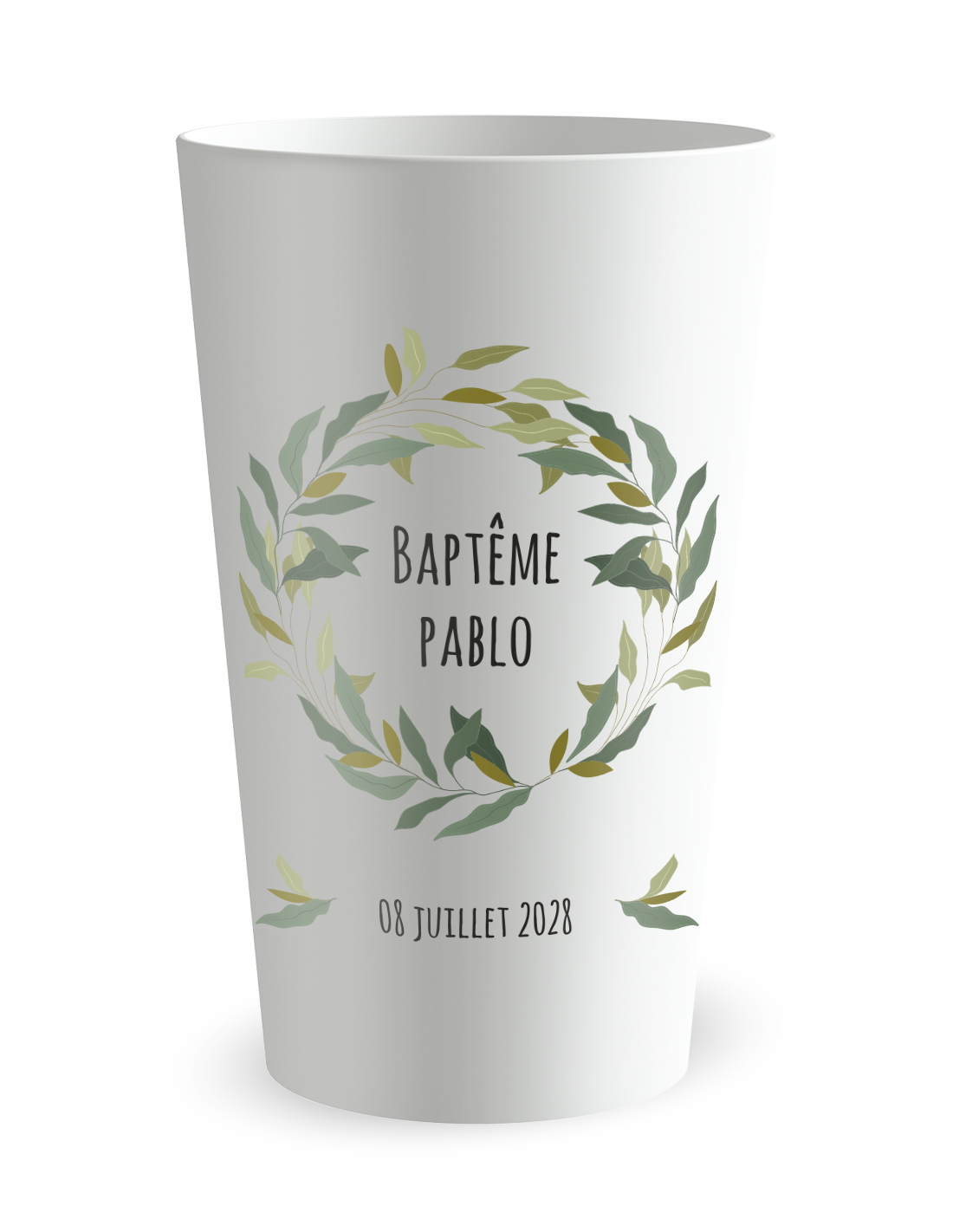 Pour un baptême sur le thème nature, ce modèle couronne de feuillages verts et gris fait le lien entre la déco et la table. Le cadre ocre met bien en valeur le prénom et la date. Vos invités repartent avec un Ecocup simple à reconnaître, associé à ce moment-là.