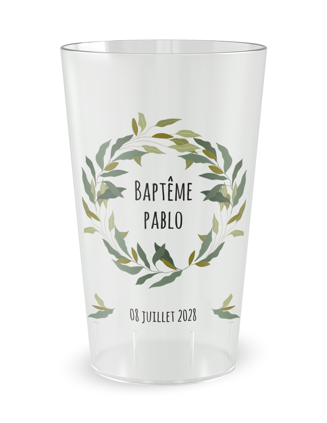 Le motif feuillu et délicat de cette édition spéciale puise son inspiration directement dans la beauté sereine des couronnes botaniques traditionnelles. Ce visuel somptueux, où chaque nervure semble tracée avec une précision absolue, se déploie harmonieusement sur toute la surface de votre ecocup baptême. Qu'il soit imprimé sur une structure au rendu givré translucide élégant qui laisse deviner la couleur de vos rafraîchissements, ou sur un modèle blanc opaque éclatant qui fait ressortir l'intensité des teintes organiques, le résultat est tout simplement magistral. Cette véritable petite œuvre d'art s'intègre à la perfection dans une décoration bohème, chic ou champêtre, apportant une touche de pureté indéniable. L'encre fusionne avec la matière de manière si fluide que le design offre à l'œil un spectacle reposant, noble et totalement captivant pour l'ensemble des convives.