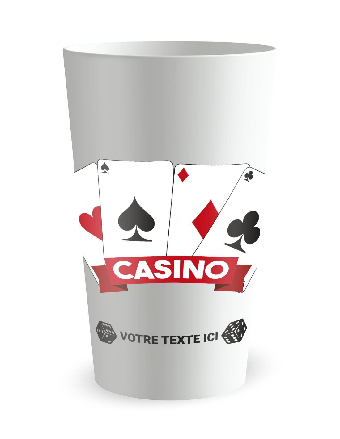 Pour une soirée casino, ce gobelet cartes, dés et ruban est dans le thème. Il convient pour une soirée étudiante, une association ou une animation de club. Vous personnalisez textes, couleurs et éléments pour faire passer votre propre message.