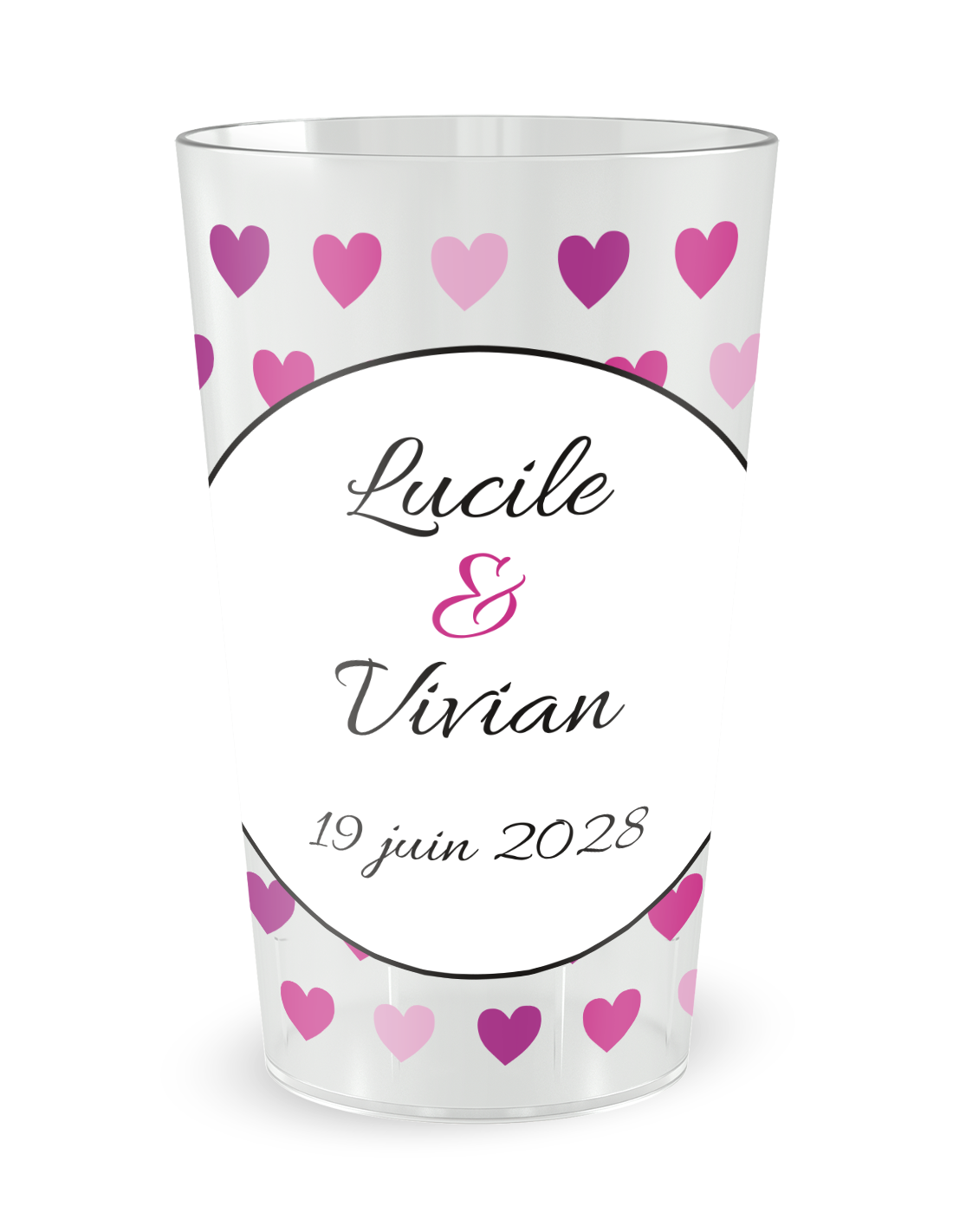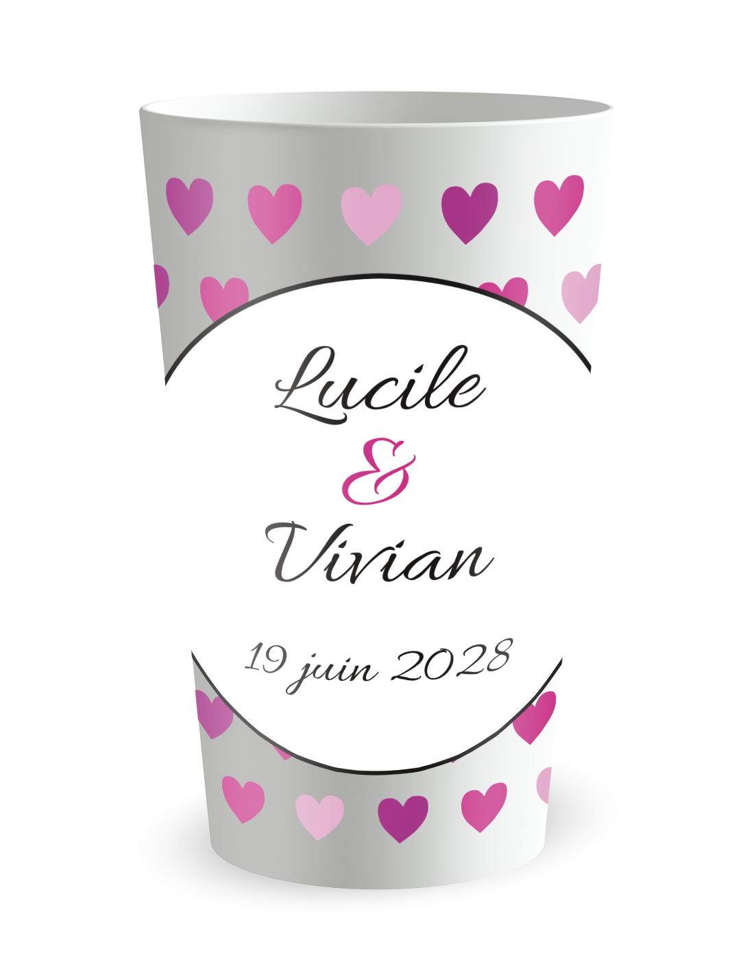 Ce gobelet de mariage aux cœurs roses, mauves et rouges reprend le thème de l’amour sans en faire trop. Les prénoms au centre restent le point focal. Un visuel facile à lire, qui accompagne bien les photos de table.