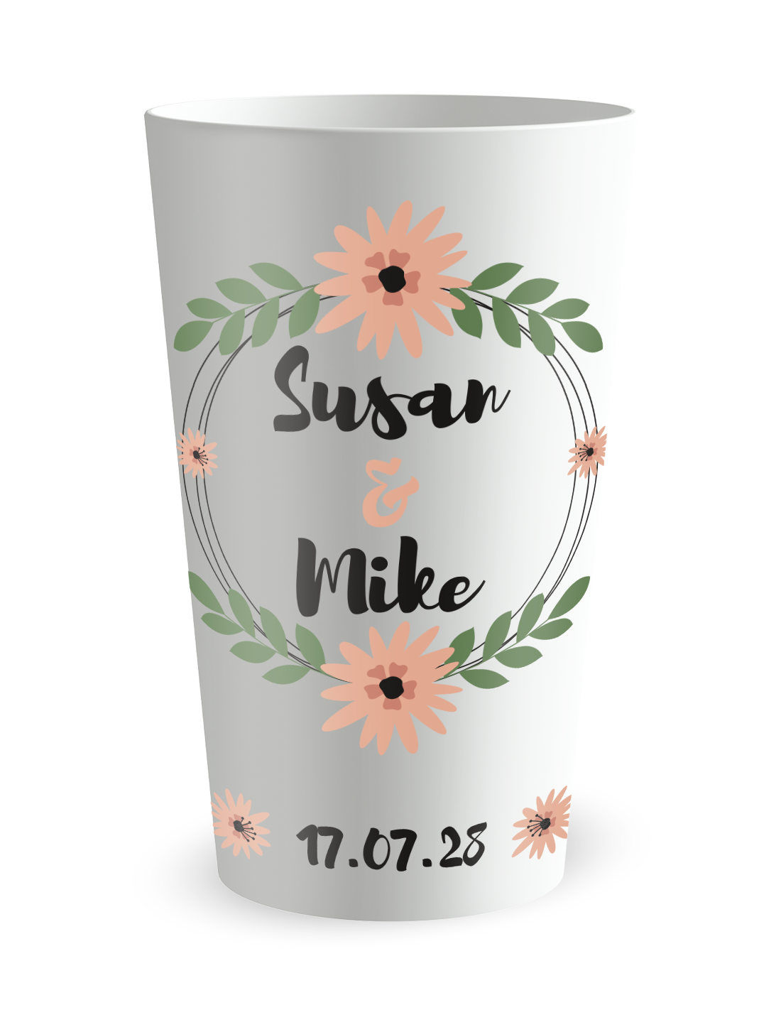 Ici, une couronne de fleurs centrale et de petits motifs floraux en bas structurent le gobelet. Ajoutez vos prénoms et la date du jour J pour fixer l’événement sans lourdeur. Un choix sûr pour un décor de mariage doux.
