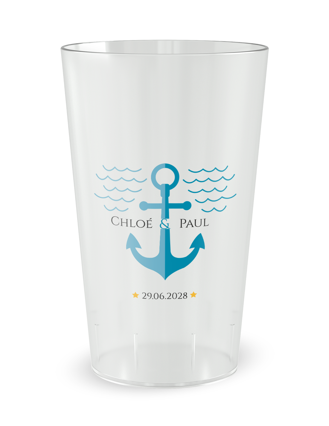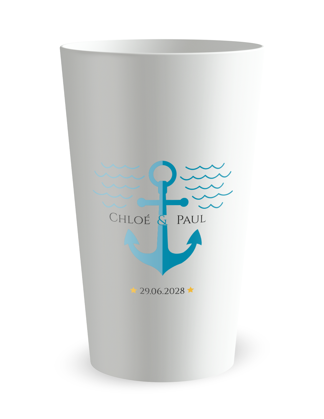 Pour les amoureux de la mer, ce gobelet met en avant ancre et hublot. Il accompagne un mariage au bord de l’eau ou un thème marin plus large. Les textes s’adaptent facilement à votre scénario.