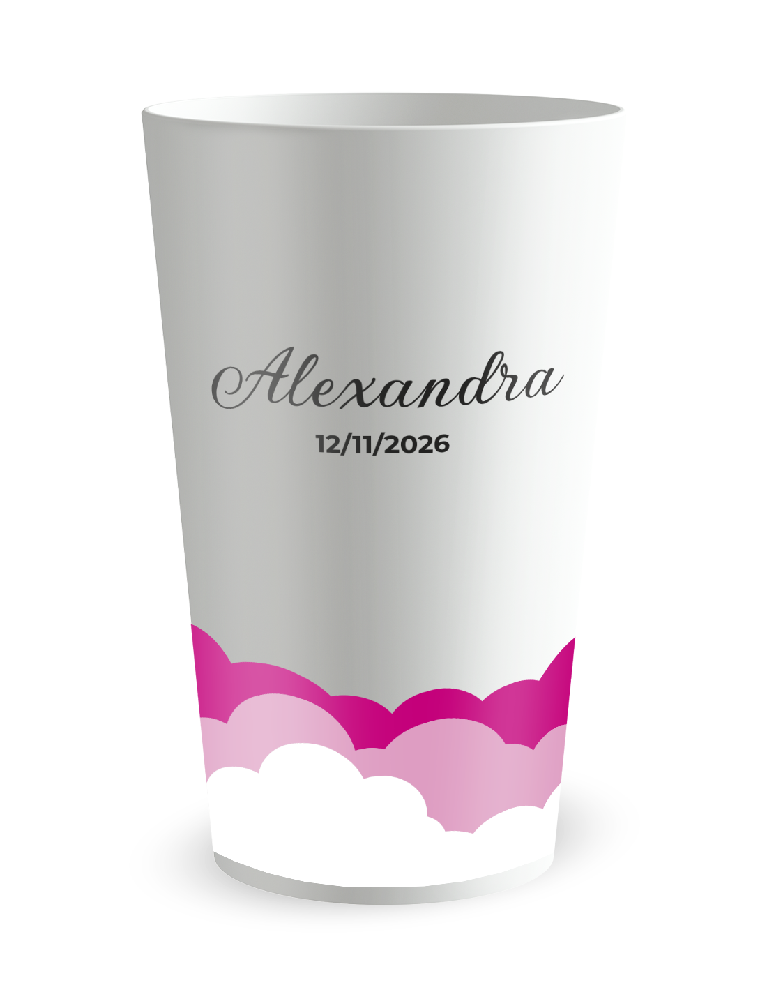 L'esthétique de ce modèle a été soigneusement travaillée pour refléter l'insouciance des premiers instants de la vie. Ce gobelet personnalisé enfant se distingue par son motif de fond nuageux aux teintes pastel, évoquant un ciel de rêve parfaitement adapté à l'univers d'une petite fille. L'impression numérique de haute précision assure un rendu impeccable des dégradés de couleurs, créant un contraste délicat avec la paroi givrée du gobelet. Que votre événement se déroule sous la lumière tamisée d'un salon ou lors d'un goûter en plein air, le visuel reste éclatant et raffiné. Chaque détail graphique est pensé pour sublimer vos buffets de douceurs, transformant un objet utilitaire en un véritable support d'émotion qui valorise l'importance de ce nouveau chapitre familial avec une élégance rare.