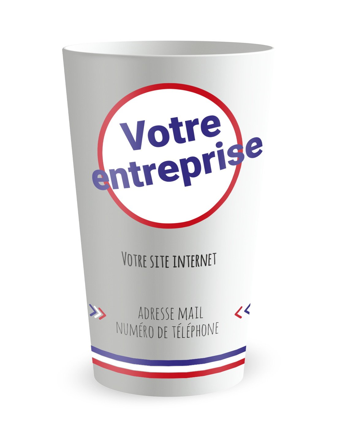 Ce modèle bleu blanc rouge permet de rappeler en un coup d’œil votre lien au “Made in France”. Textes, visuels et logos se personnalisent simplement dans l’outil en ligne. Vous obtenez un gobelet carte de visite qui parle de votre activité et de votre origine.