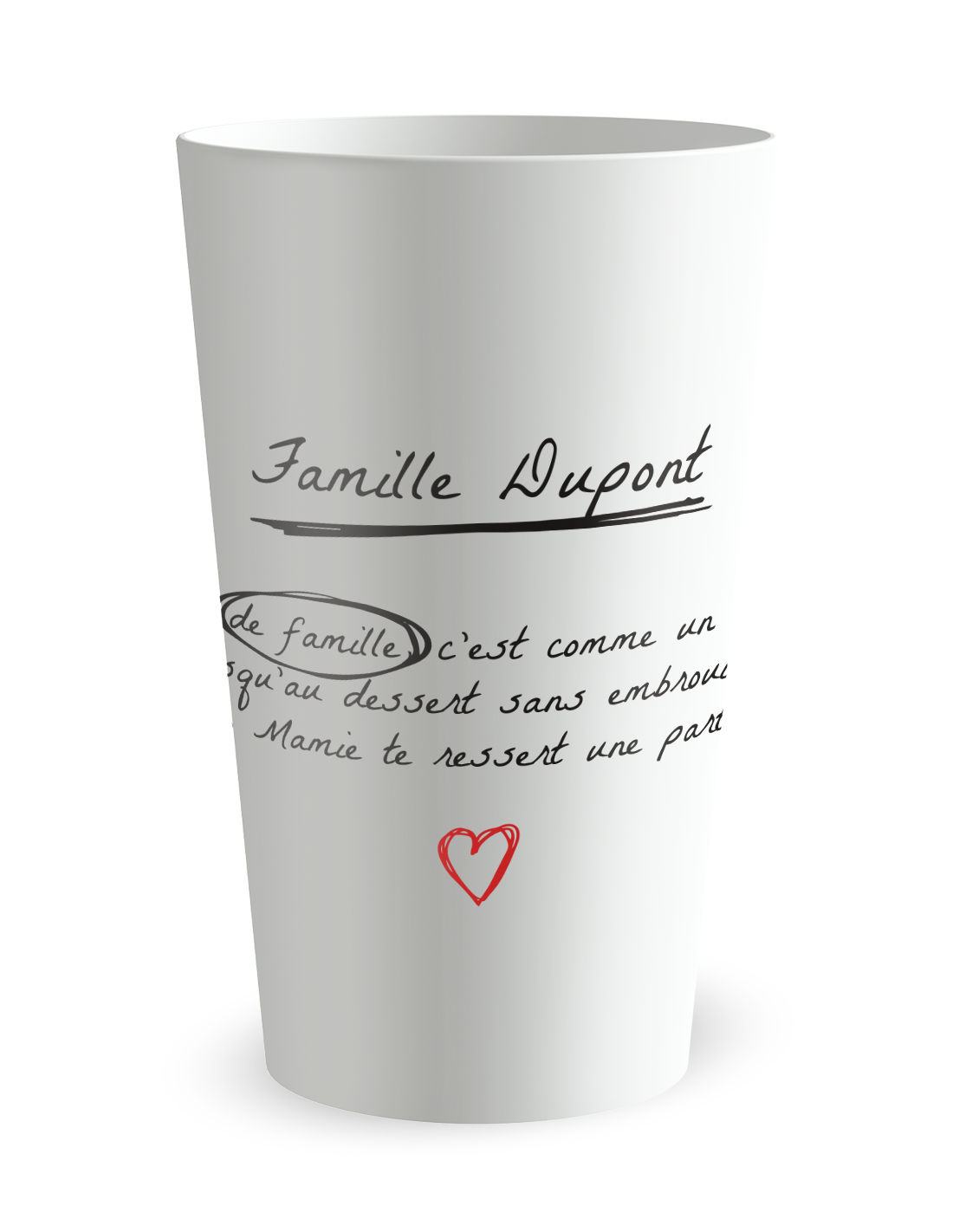 Ce modèle “Fête de famille” accompagne les grandes tablées. Un seul format pour toutes les générations. Ajoutez le nom de la famille, la date ou le lieu. Les gobelets restent ensuite comme trace de ce rassemblement.