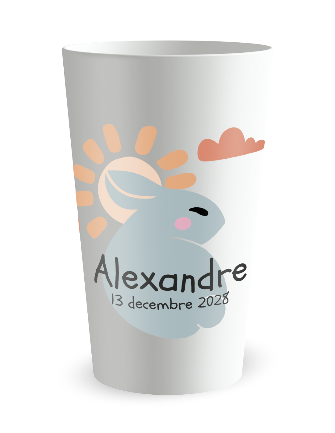 This rabbit model frames the child's first name with softness. It is suitable as much for first visits as for following snacks. Add date, place or small message in the foreseen area. The cup then follows the family daily.