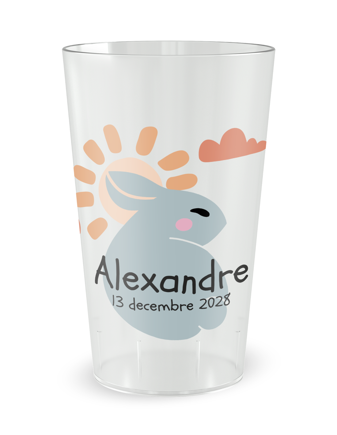 De esthetiek van dit model is zorgvuldig bewerkt om de onschuld van de eerste dagen te weerspiegelen. Met zijn delicate illustratie onderscheidt dit gepersonaliseerde geboorteglas zich door een idyllisch kader rondom een klein konijntje met fijne trekken, symbool van kalmte en bescherming. De zeer nauwkeurige digitale print zorgt voor een onberispelijke weergave van de nuances, waardoor een subtiel contrast ontstaat met de matte wand van de beker. Of uw evenement nu plaatsvindt in de intimiteit van een familiekamer of tijdens een grote welkomstborrel, het beeld blijft stralend en verfijnd. Elk grafisch detail is ontworpen om uw buffetten of sapbars te verfraaien, waardoor een gebruiksvoorwerp wordt omgevormd tot een ware drager van emotie die het belang van dit nieuwe hoofdstuk in uw gezinsleven benadrukt.