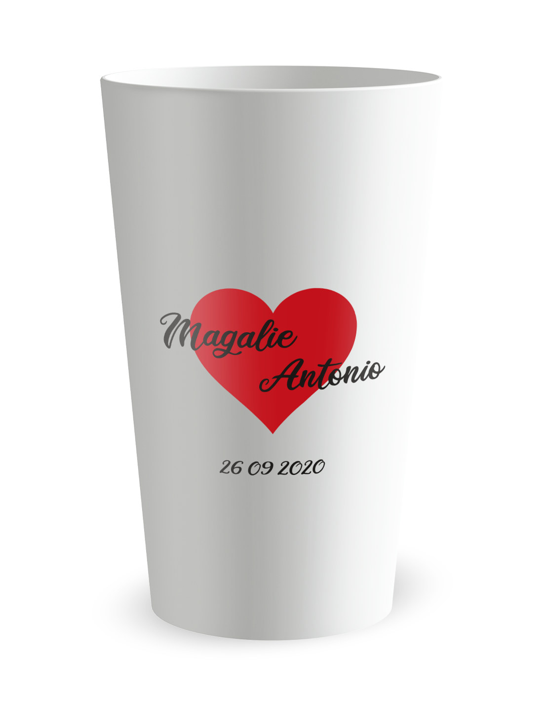 Deze trouwbeker heeft een romantische zijde met hart en voornamen, en een lichtere zijde met een humoristische zin. Je past elk woord aan jouw stijl aan. Eén beker om de twee facetten van jullie relatie uit te drukken.