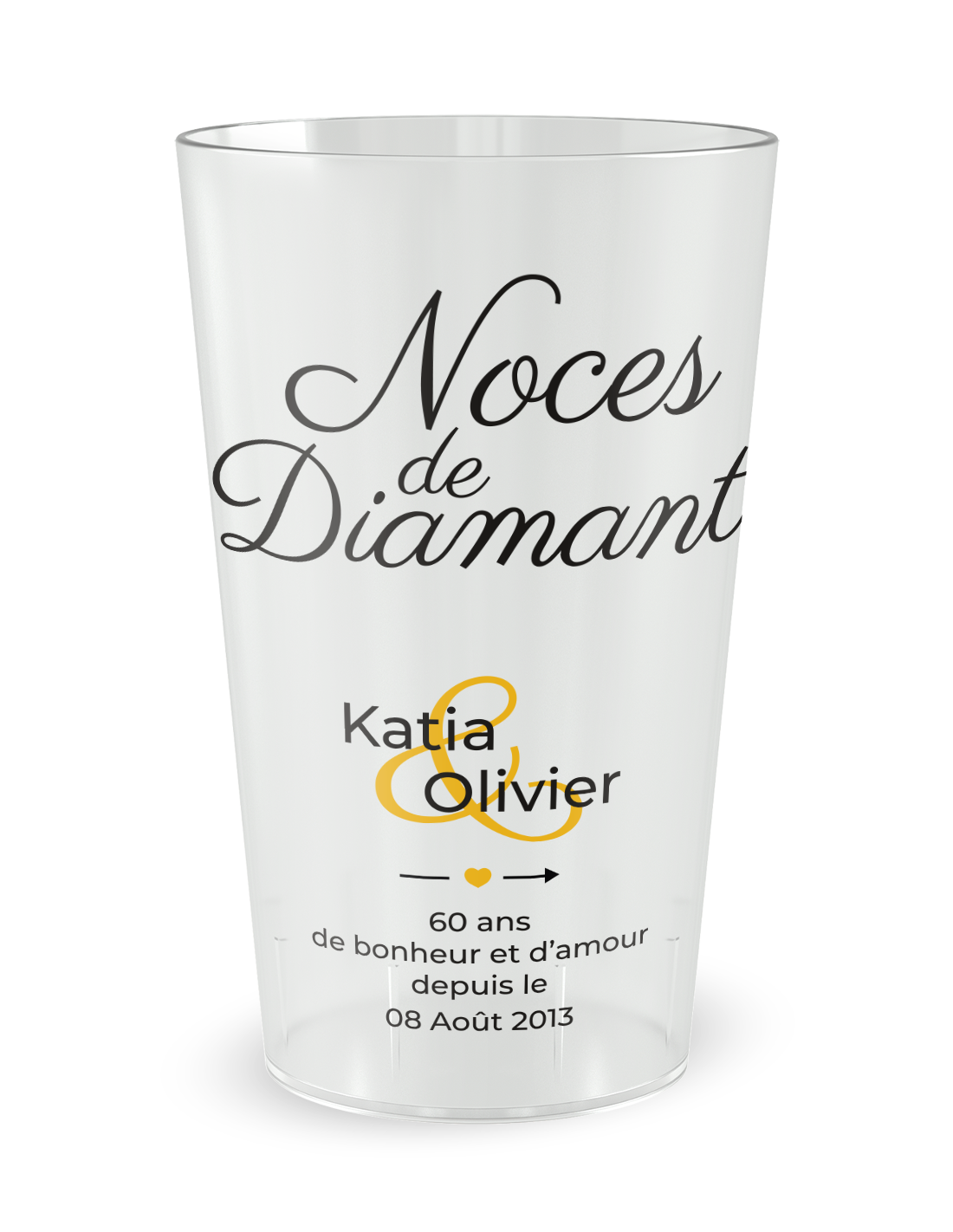 Het ontwerp van de Gepersonaliseerde Trouwbeker 60 Jaar - Diamanten Bruiloft - 25 CL onderscheidt zich door een visuele identiteit van extreme verfijning, die de unieke glans en de sprankelende facetten van de kostbaarste steen oproept. Deze exclusieve afbeelding wordt versterkt door een bedrukking op plastic beker van hoge definitie, wat garant staat voor contrasten van kristalheldere puurheid en een onberispelijke scherpte van lijnen op de matte textuur van de beker. Het licht speelt met de nuances van het motief om een hoogwaardige weergave te creëren, waarbij de fijnheid van de markering wordt benadrukt en de helderheid van uw dranken wordt geaccentueerd. Dit glas is niet alleen functioneel; het wordt een echt verzamelobject dat een vleugje onderscheiding en moderniteit toevoegt aan uw diamanten jubileum.