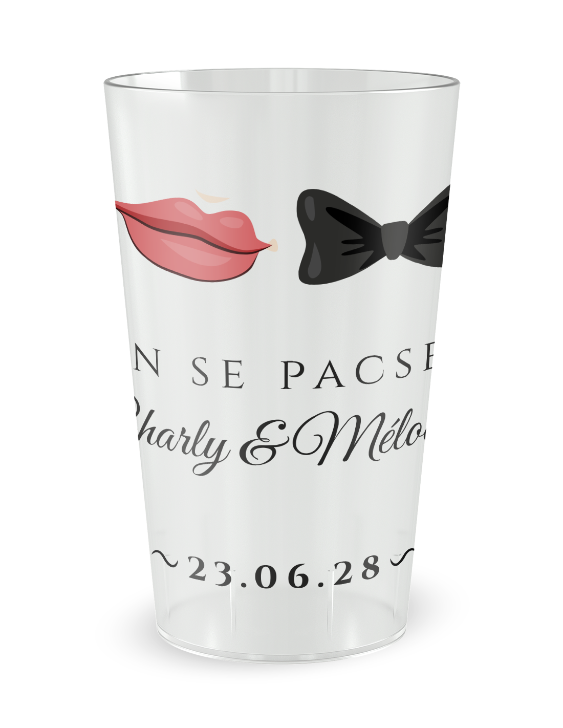 De beker "On se pacse" draagt de boodschap duidelijk uit, met mond en vlinderstrik als knipoog. Je personaliseert hem met namen, datum en grafische details. Een eenvoudig aandenken om deze mijlpaal te vieren.