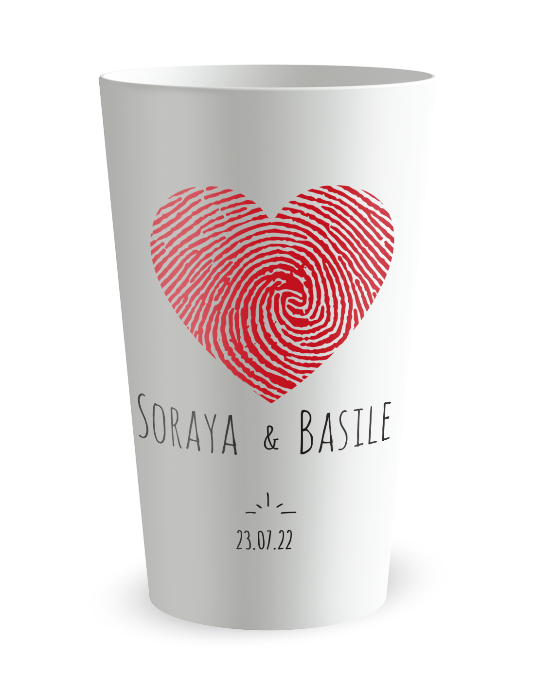 De magnetische aantrekkingskracht van deze creatie ligt in de poëzie van de illustratie, die twee vingerafdrukken toont die samensmelten tot een delicaat hart, een universeel en tijdloos symbool van uw wederzijdse toewijding. Dit emotionele motief ontvouwt zich met chirurgische precisie over de gehele cilindrische wand. Of u nu valt voor de zachtheid van een elegante, doorschijnende matte afwerking, die de fruitige reflecties van uw verfrissingen subtiel laat ontsnappen, of dat u de voorkeur geeft aan een stralende ondoorzichtige witte achtergrond die de diepte van de inkten vertienvoudigt, de impact van dit majestueuze gepersonaliseerde trouwglas blijft verbluffend. De hightech pigmenten versmelten letterlijk met het plastic materiaal, wat een opvallend visueel contrast en een onberispelijke scherpte van de papillaire lijnen garandeert. Deze gedurfde en romantische grafische identiteit past goddelijk bij uw bloemstukken, uw verzorgde tafellinnen en de gedempte sfeer van uw zaal, en voegt een onbetwistbare vleugje elegantie toe aan uw decoratie.