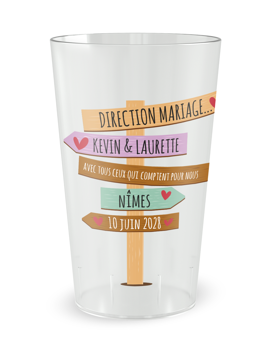 De onweerstaanbare aantrekkingskracht van deze creatie ligt in de absolute fijnheid van de illustratie, geïnspireerd op de beroemde wegwijzers van verweerd hout of leisteen die bloeien in bohemien decoraties. Uw gepersonaliseerde ecocup huwelijksrichting ontvouwt zijn gekruiste pijlen en retro typografieën met een ongekende precisie, waarbij elke letter met de hand lijkt te zijn geschilderd door een nauwgezette ambachtsman. Of uw keuze nu valt op een elegante doorschijnende matte textuur, die subtiel de fruitige tint van uw verfrissingen laat doorschemeren, of op een stralend ondoorzichtig wit dat de volle kracht van de contrasten onthult, het resultaat is spectaculair. De hoogtechnologische inkt versmelt letterlijk met het materiaal, en verandert deze eenvoudige beker in een authentiek gepersonaliseerd bruiloftsglas dat men met bewondering bekijkt. Deze esthetische harmonie past goddelijk bij hooibalen, lampionnen en landelijke tafelstukken, en verlicht uw receptieruimte met een onvergelijkbare visuele zachtheid.
