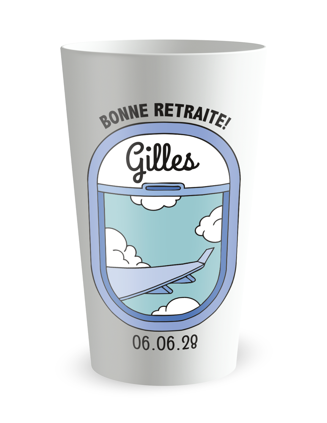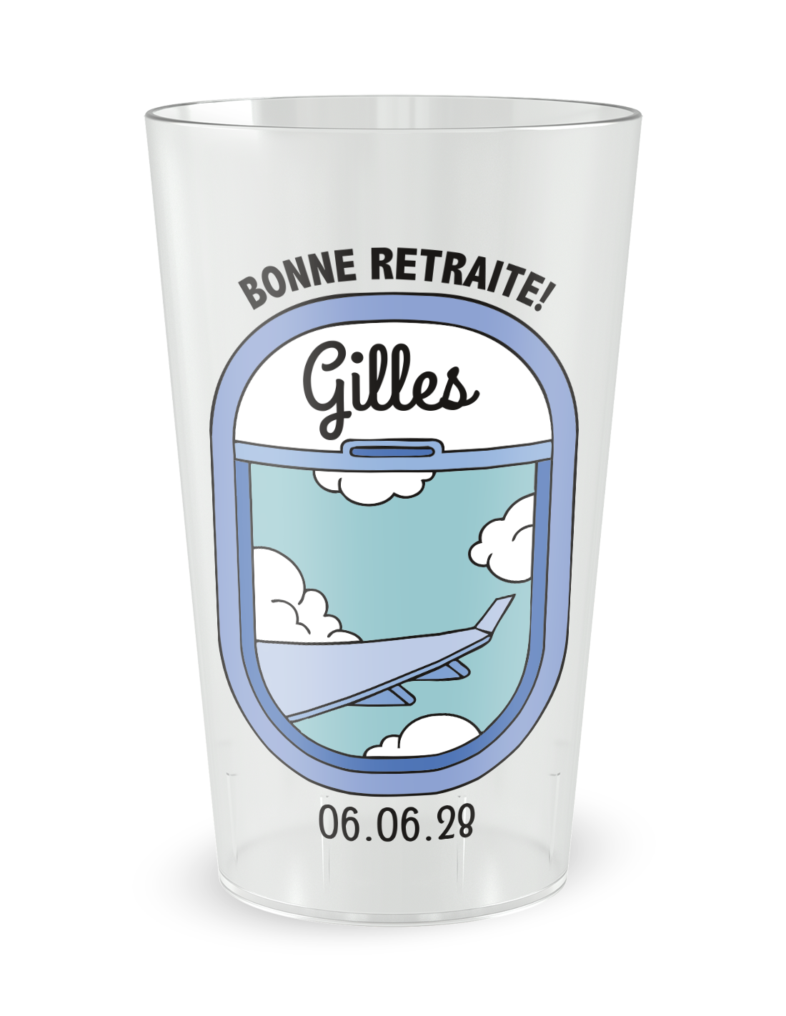 De esthetiek van dit model is zorgvuldig bewerkt om de verbeelding van de reiziger en de belofte van verre landen vast te leggen. Deze gepersonaliseerde pensioenbeker onderscheidt zich door de fijnheid van zijn digitale lijn, die een silhouet van een vliegtuig toont dat opstijgt naar heldere luchten. De precisie van de bedrukking zorgt voor een levendige weergave waarbij elk grafisch detail het belang van deze levensverandering benadrukt. Of het nu voor een alcoholvrije cocktail of een vers geperst vruchtensap is, de subtiele transparantie van het matte materiaal verfraait de kleuren van uw dranken, waardoor een perfecte visuele harmonie op uw feesttafels ontstaat. Het is het ideale accessoire om een dynamiek van vrijheid en enthousiasme aan uw evenement te geven, waardoor elke slok een vertrek naar sereniteit wordt.