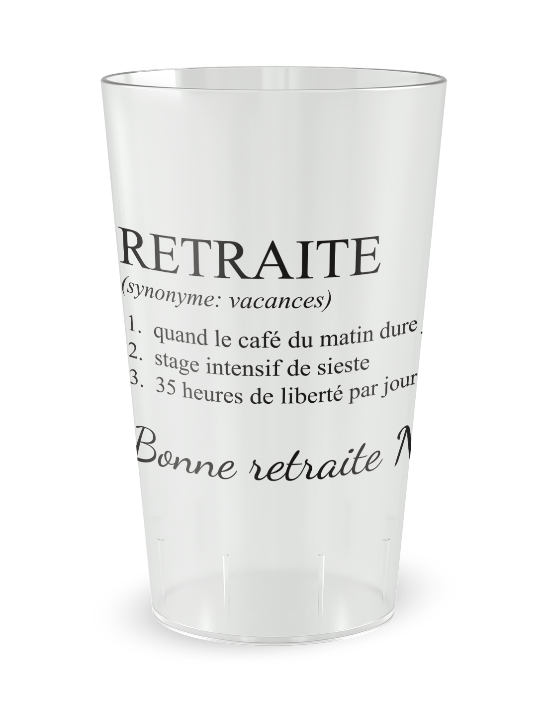 Het ontwerp van dit model is gebaseerd op een sobere en typografische esthetiek, waarbij een poëtische of humoristische definitie van het pensioen centraal staat. Dit gepersonaliseerde pensioen glas onderscheidt zich door de scherpte van de digitale print, waarbij elke letter met chirurgische precisie wordt gereproduceerd voor perfecte leesbaarheid. De contrasten tussen de tekst en de matte wand van de beker creëren een opvallend visueel effect dat de aandacht trekt en onmiddellijk tot lezen aanzet bij uw gasten. Of u nu ambachtelijke vruchtensappen of uitgebreide alcoholvrije cocktails serveert, de decoratie blijft het pronkstuk van het buffet. Deze moderne grafische benadering zorgt ervoor dat het product zich aan alle bedrijfssectoren aanpast, en voegt een vleugje intellectuele verfijning toe aan uw tafeldecoratie terwijl het de mens achter de functie viert.