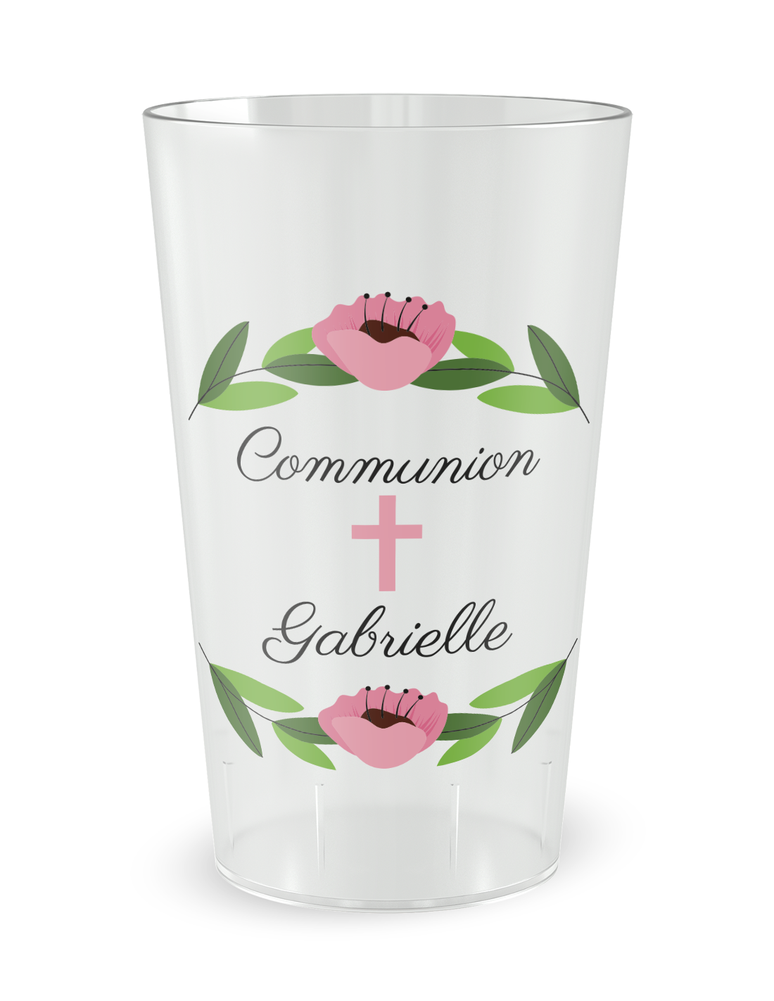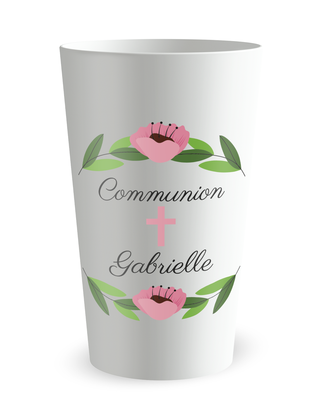 Elegant, deze personaliseerbare communiebeker vindt gemakkelijk zijn plaats op tafel. Bloemenkrans, kruis en tekstvelden accentueren de voornaam en de datum. Een eenvoudig voorwerp om deze mijlpaal te markeren en een tastbare herinnering voor de gasten achter te laten.