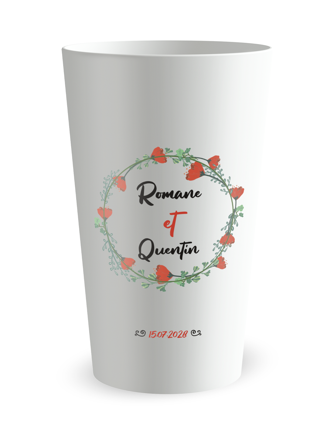 De klaproos, de veldbloem bij uitstek, siert deze trouwbeker. De krans van klaprozen omlijst de voornamen en de datum, terwijl de achterkant een eenvoudig en duidelijk “Pour la vie” toont. U kunt kleuren en elementen aanpassen naar uw decor.