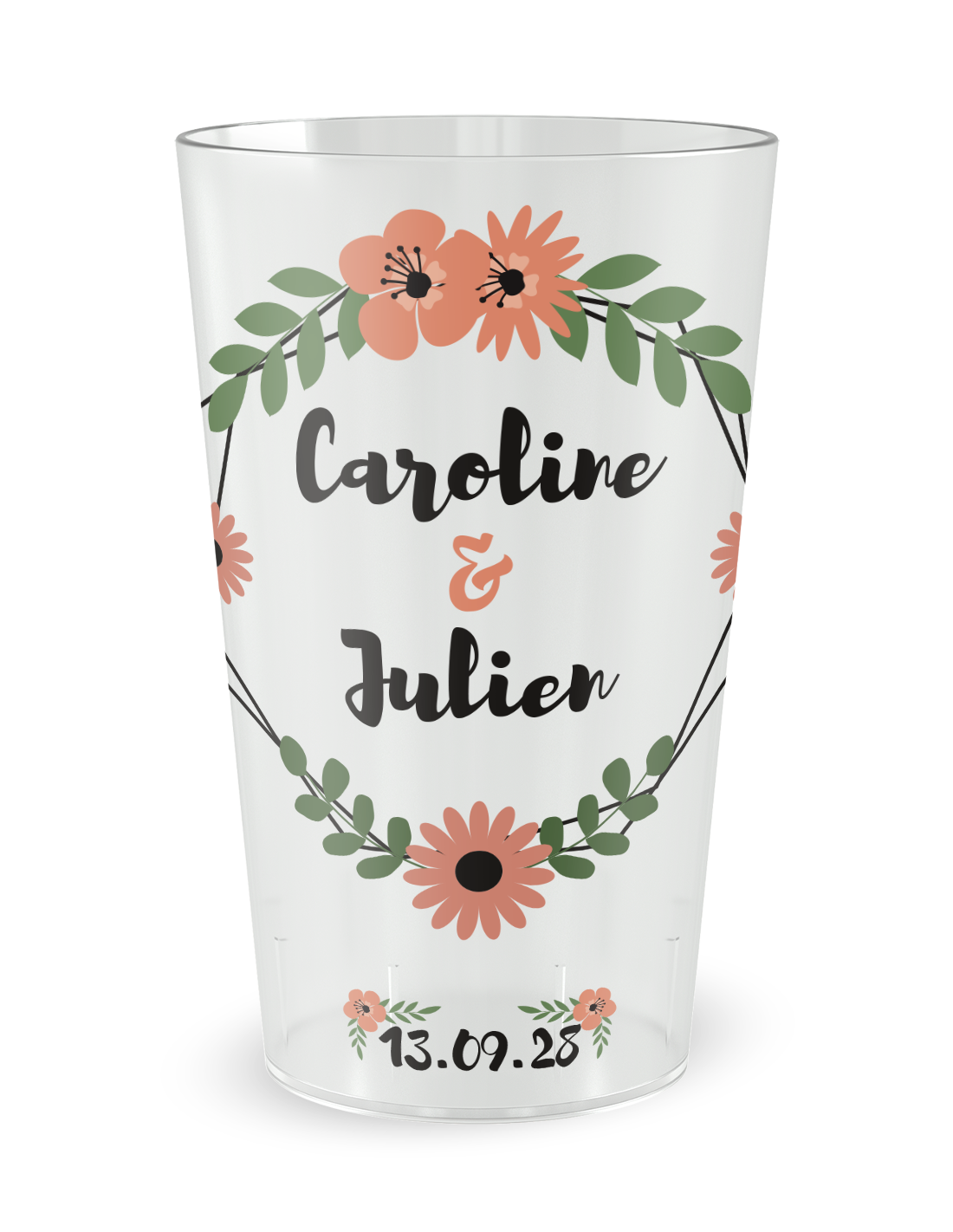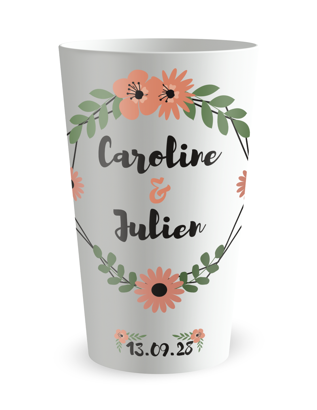 Met romantische en landelijke inspiratie kan deze bloemenkroon beker gepersonaliseerd worden met jullie voornamen en de datum. Jullie kunnen er ook een bedanktekst of een foto aan toevoegen. Hij past zowel bij een kleine receptie als bij een groot huwelijk.