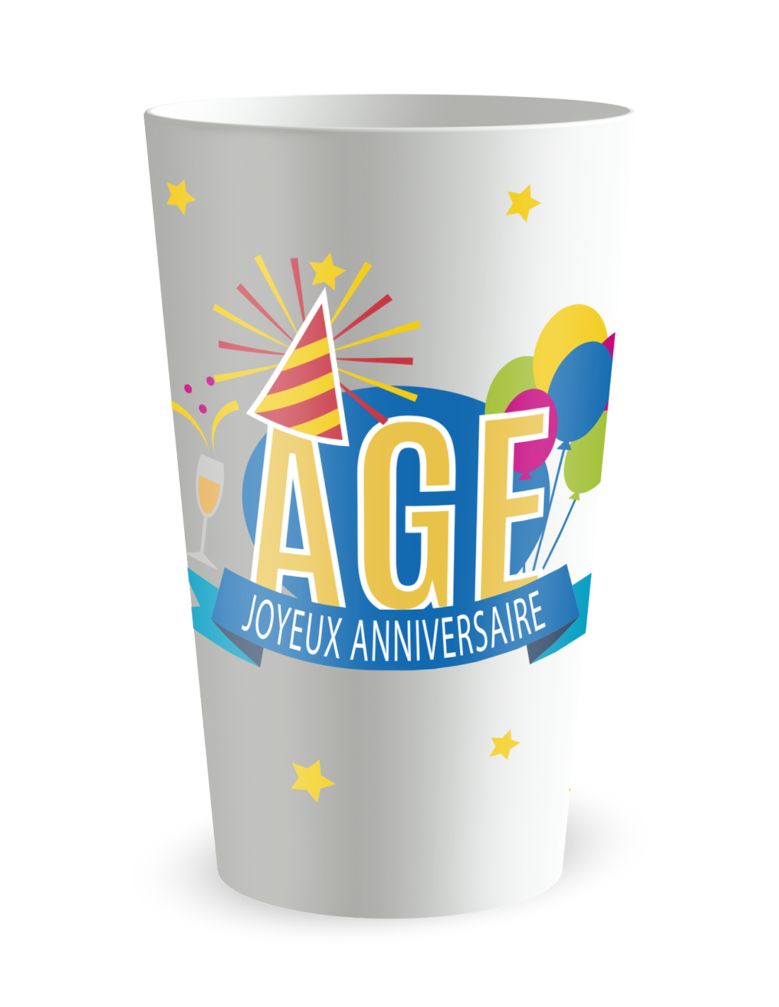 Met zijn feestslinger, vuurwerk, sterren en ballonnen omvat deze verjaardagsbeker alle feestelementen. Personaliseer tekst en leeftijd, eventueel de kleuren, en voeg indien nodig andere elementen toe. Zo creëert u een zeer persoonlijk ontwerp voor een al even persoonlijk moment.