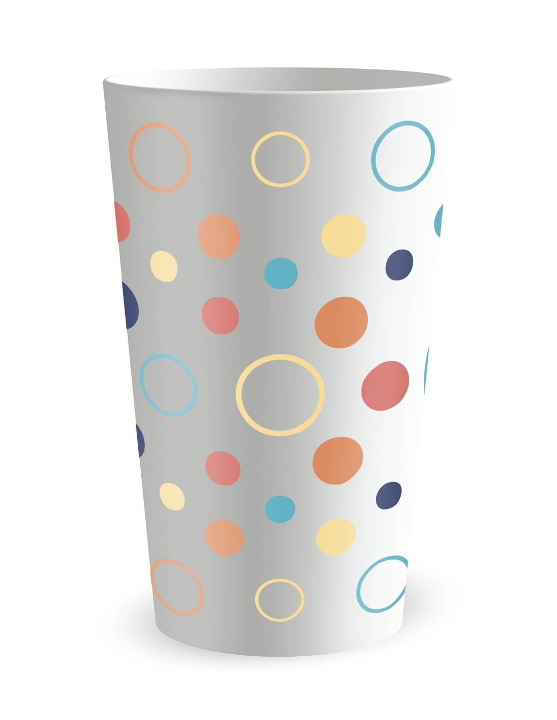 Deze beker is versierd met gekleurde rondjes als confetti. Hij geeft ritme aan de tafel zonder de overhand te nemen. Personaliseer hem met de datum en enkele woorden. We bewaren hem voor de volgende feesten of dagelijks.