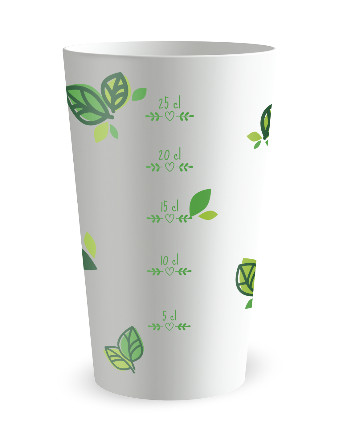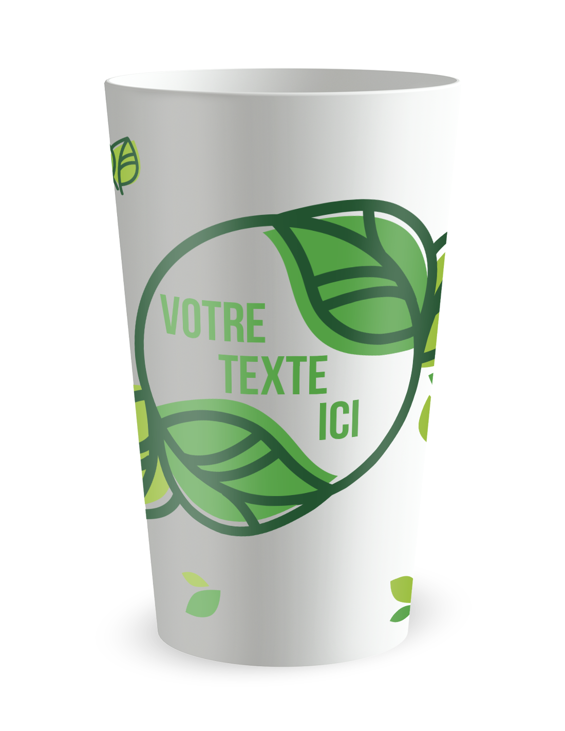 Deze beker met plantencirkel is een heldere basis om uw boodschap over te brengen. In het midden, een leesbaar tekstvak voor uw naam, uw slogan of een krachtige zin; eromheen, een bladmotief dat een frisse sfeer creëert zonder te overdrijven. Hij vergezelt natuurlijk uw zakelijke evenementen, uw open dagen of uw interne activiteiten, terwijl hij dezelfde geruststellende vorm van een Ecocup behoudt.