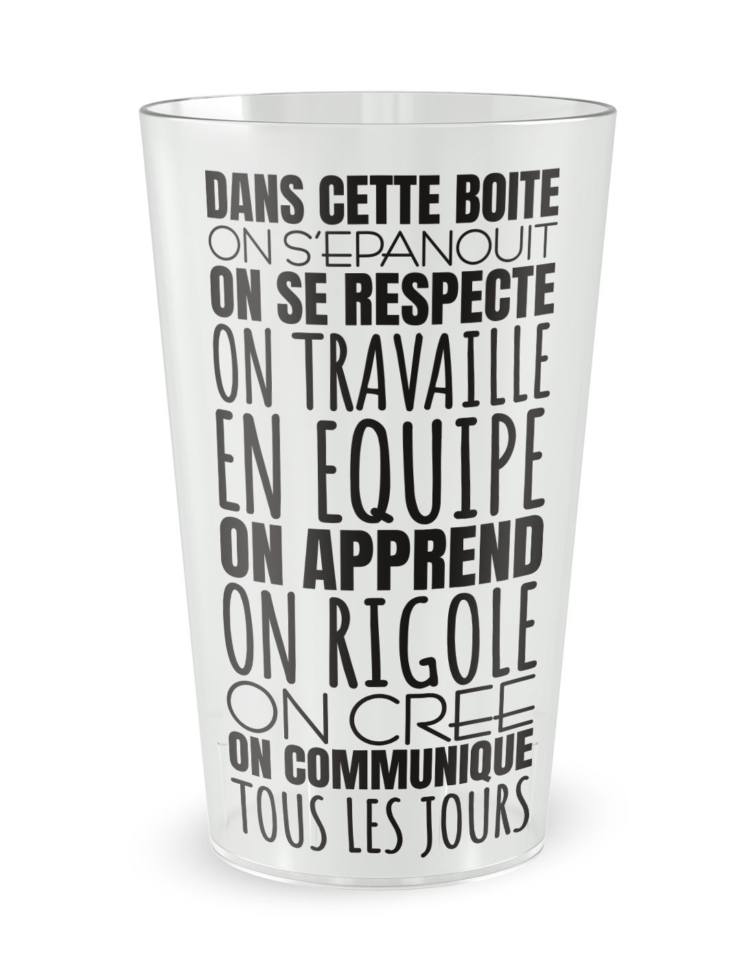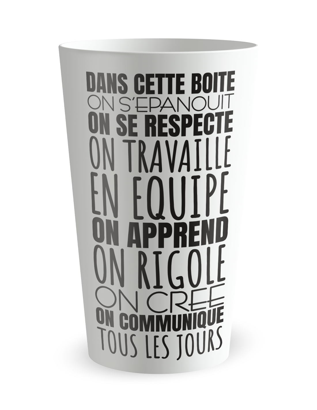De esthetiek van de gepersonaliseerde bedrijfsbeker gewijd aan teams is gebaseerd op een strak en dynamisch ontwerp, dat zich kan aanpassen aan alle huisstijlen van bedrijven. Of u nu de elegante transparantie van een matte afwerking verkiest of de premium uitstraling van ondoorzichtig wit, de kwaliteit van de digitale print, uitgevoerd in onze Franse ateliers, garandeert een absolute scherpte van lijnen en kleuren. Deze geavanceerde technologie zorgt voor een totale fusie van de decoratie met de bekerwand, waardoor elke degradatie van het motief wordt voorkomen, ondanks dagelijks gebruik. Het "Team"-ontwerp fungeert als een ware standaard voor uw medewerkers, en herinnert er subtiel aan dat elk individu bijdraagt aan het algehele succes van het bedrijf, terwijl het een vleugje modern professionalisme toevoegt aan uw kantoren en sociale ruimtes.